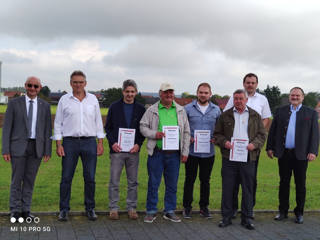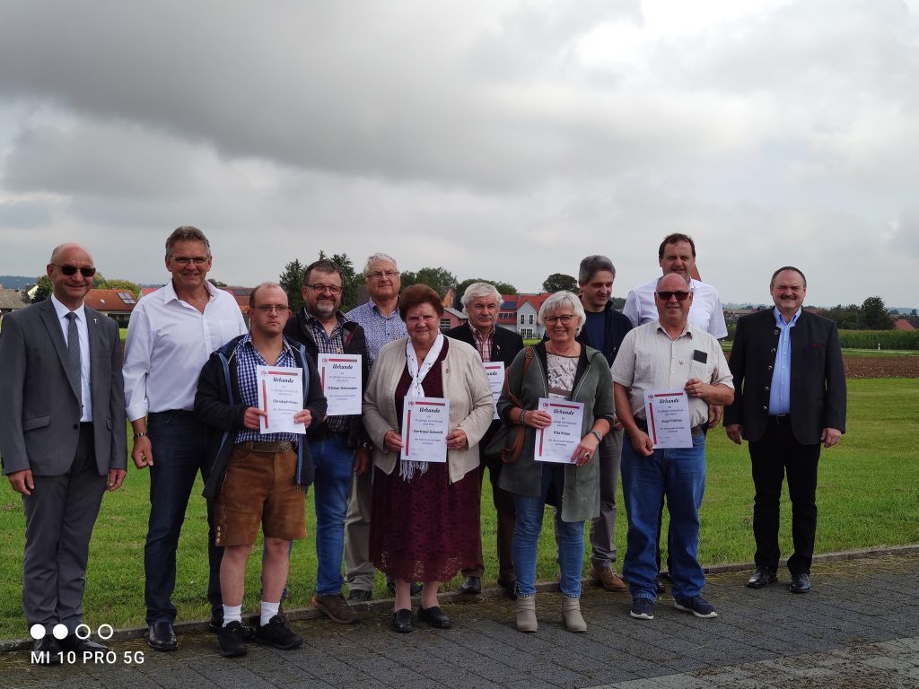 Nach dem sehr gut besuchten Gottesdienst auf dem Stockplatz in Grafenberg, der vom Geistlichen Beirat Pfarrer Johannes Trollmann zelebriert und von der Blaskapelle Euerwang musikalisch umrahmt wurde, fanden Ehrungen statt.